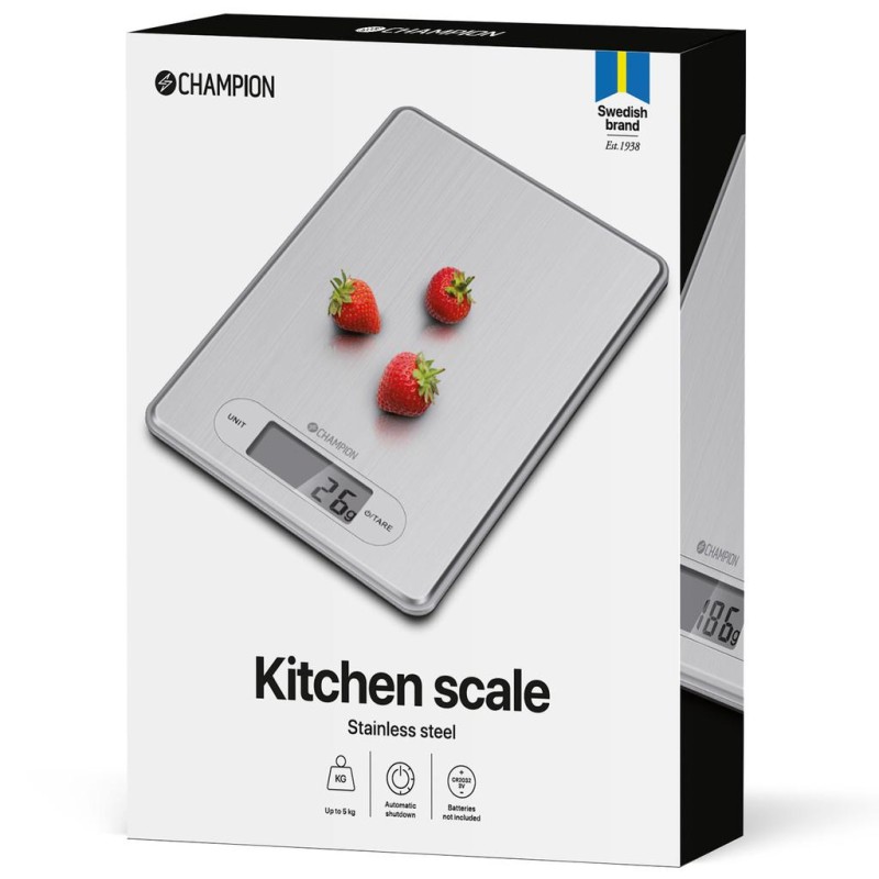 Champion Köksvåg är en slimmad våg i rostfri finish med tydlig display där du enkelt ser resultatet av vägningen. Den praktiska nollställningsfunktionen gör att du kan väga ingredienser utan att skålen tas med eller om du vill addera fler ingredienser i samma skål. Champions köksvåg har en hög precision och en max-kapacitet på 5kg.