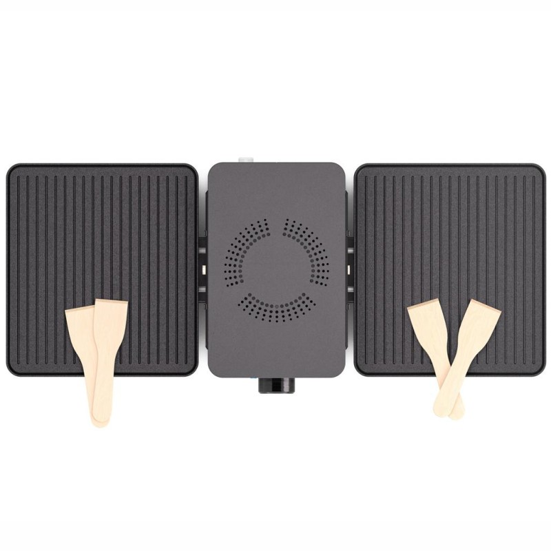 Det som särskiljer Raclette Purify är det integrerade luftfilteringssystemet, som effektivt minskar rök och lukt under matlagningen. Detta skapar en behagligare matupplevelse utan att oönskade dofter sprider sig i hemmet. De två gjutna aluminiumgrillplattorna med keramisk beläggning säkerställer jämn uppvärmning och gör rengöringen enkel.