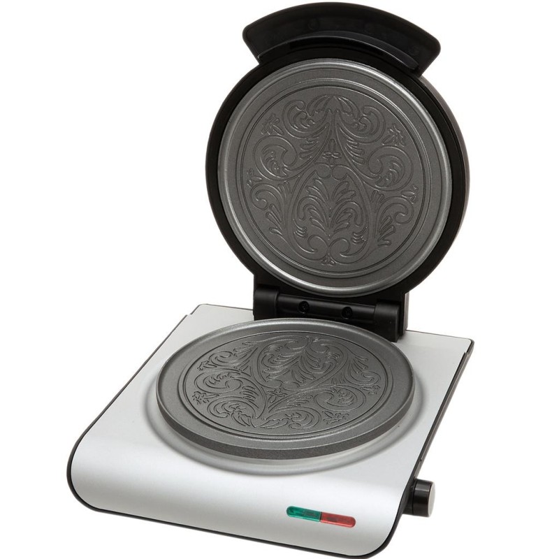 Singel våffeljärn som gräddar ett runt våffelrån eller krumkake