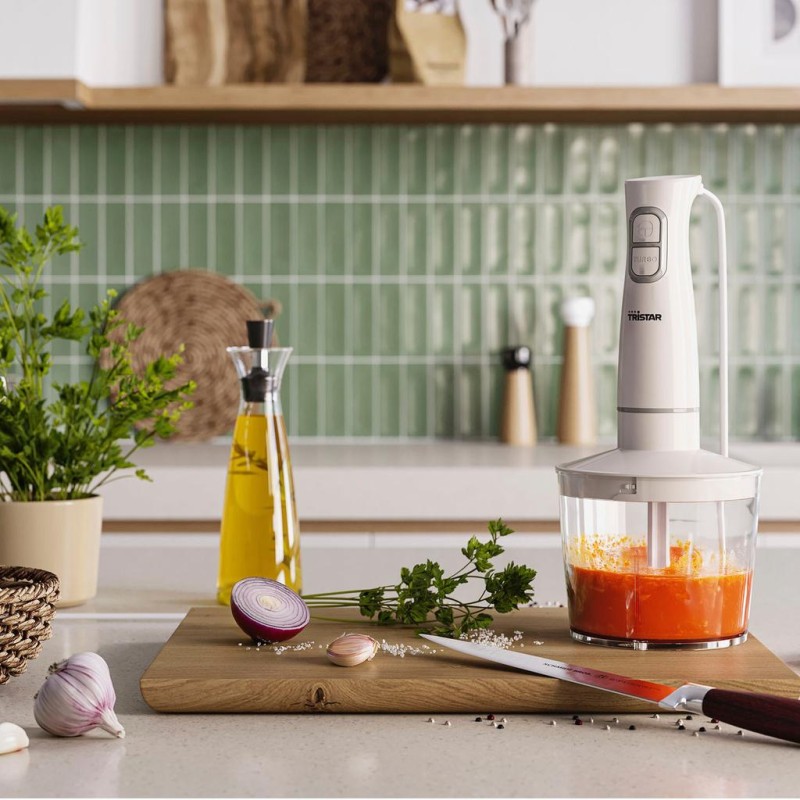 Komplett stavmixerset med hackare, visp och mätbägare. Stavmixern har en effekt på 350 W och avtagbar stav i rostfritt stål som är enkel att göra ren. Hackaren har knivar i rostfritt stål och passar perfekt för att hacka grönsaker.