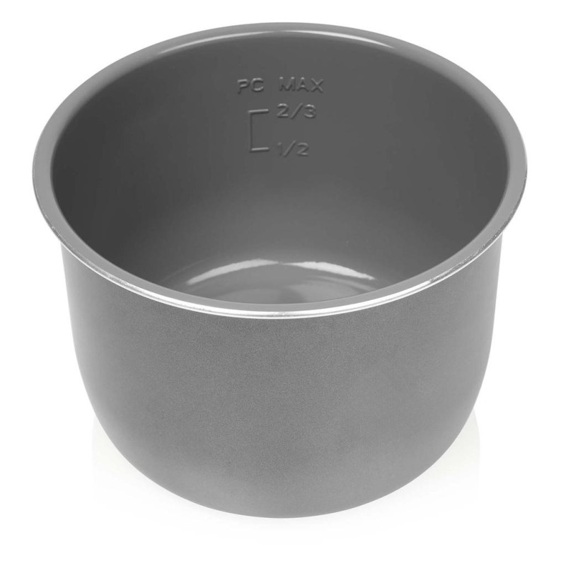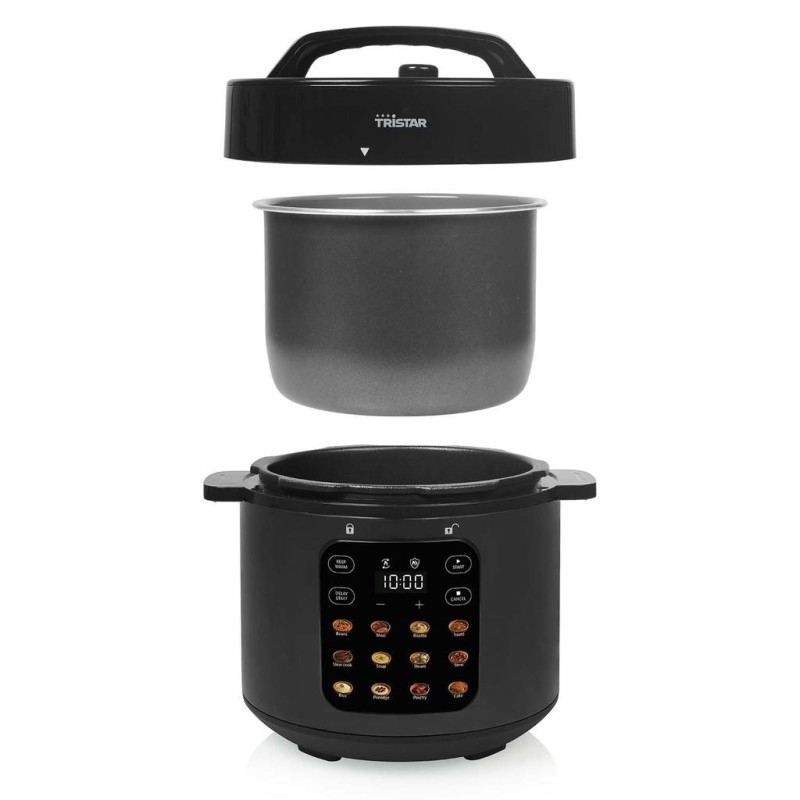 6L tryckkokare i rostfritt stål med digital kontrollpanel, 12 förinställda program och 1000W effekt. Inklusive mätkopp och ris-sked.