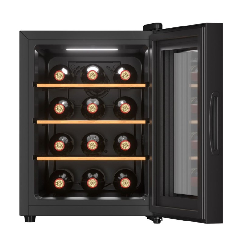 Fristående vinkyl/serveringskyl från franska La Sommelière med kapacitet för upp till 12 flaskor (Bordeaux). Snygg design och kompakt storlek gör det enkelt att hitta en plats för det i ditt hem! Vinkylen är utrustad med UV-skyddad glasdörr och integrerad pekskärm i dörren. Vinkylen har 3 ståltrådshyllor med träfronter och kallvitt LED-ljus. Den eleganta designen i svart och antracitgrått passar sömlöst i moderna miljöer.
