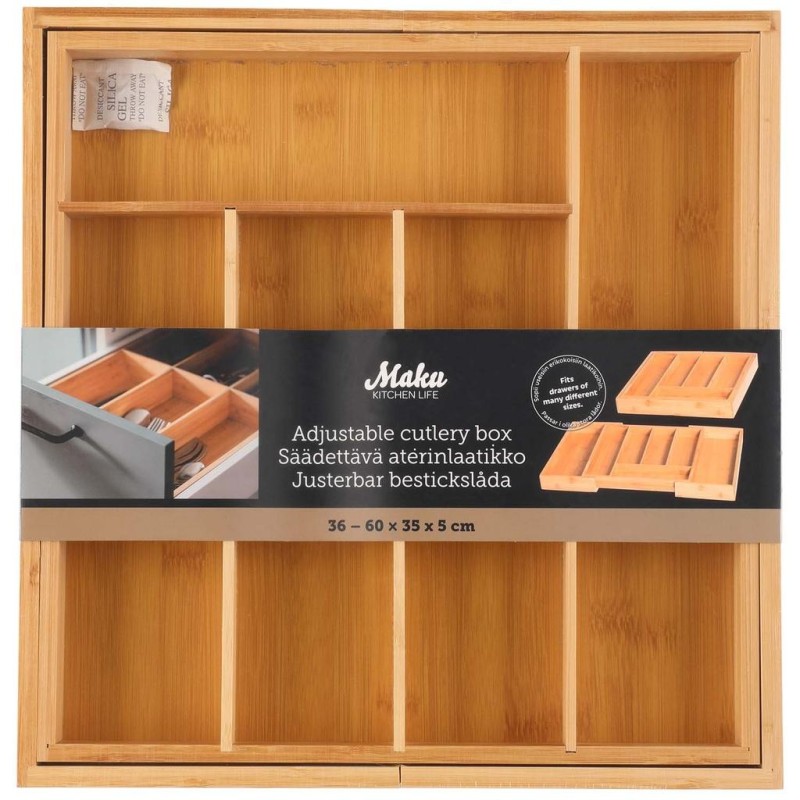 Den justerbara bredden från 36 till 60 cm gör att den passar de flesta kökslådor – perfekt för både små och stora utrymmen. Med ett djup på 35 cm får du gott om plats att organisera bestick, köksredskap och andra köksprylar på ett praktiskt och snyggt sätt. En smart och stilren lösning för ett välorganiserat kök!