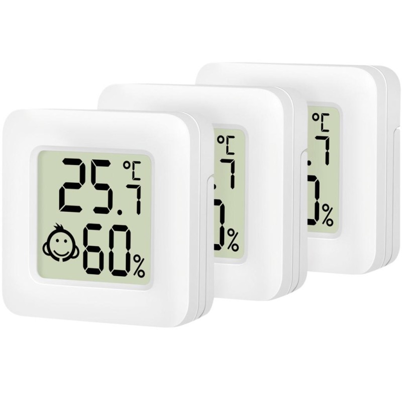 Tydlig LCD-display som visar rumstemperatur och luftfuktighet samt en enkel emoji som representerar komfortnivån.