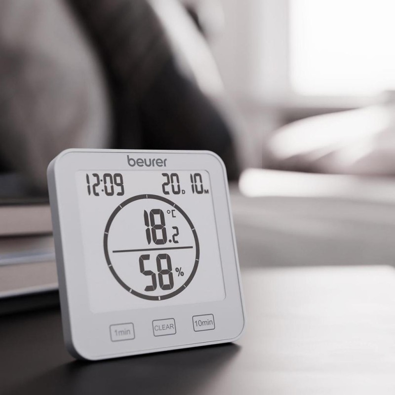 Hygrometer med stor och tydlig display som visar temperatur, relativ luftfuktighet, datum och tid