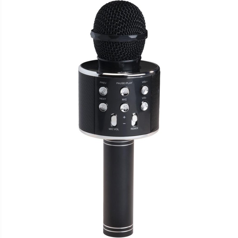 Bluetooth-högtalare med inbyggd mikrofon för karaoke. Även AUX-ingång och USB/MicroSD-kortplats för MP3-uppspelning.