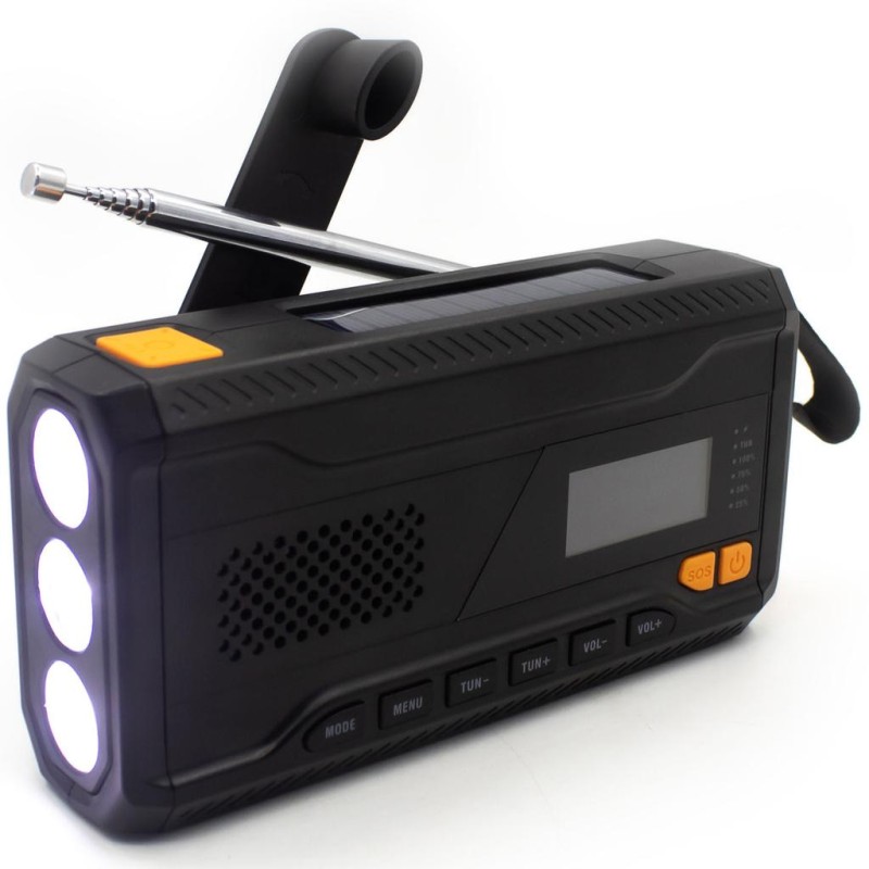 Inkluderar en 3 W LED-ficklampa, 2 W RMS-högtalare, SOS-lampa och en LCD-skärm för enkel användning – perfekt för utomhusbruk eller nödsituationer.