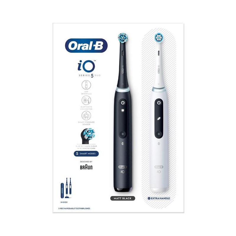 Innehåll: 2 iO5-handtag, 2 borsthuvuden, 1 resefodral, 1 laddare