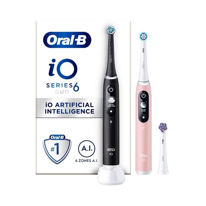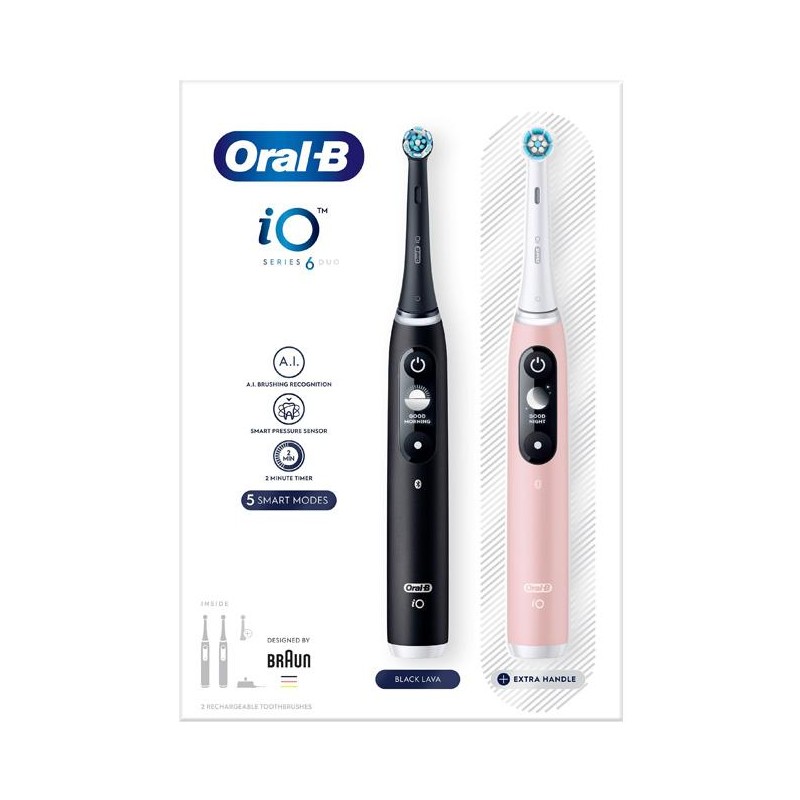 Innehåll: 2 iO6 handtag med 1 Gentle Clean-borsthuvud, 1 Ultimate Clean-borsthuvud, 1 Radiant White-borsthuvud, 1 laddare