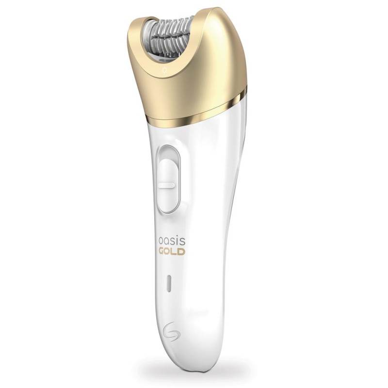 Sladdlös epilator Oasis GOLD med inbyggd vägledande ljus och två huvuden. Den innehåller två avtagbara huvuden, tillbehören för känsliga områden, ansikte, hudspänningslock, massageapparat, rakapparat med 3 mm skärhuvud.