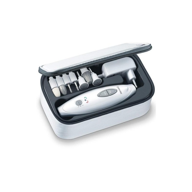 Komplett manikyr- och pedikyr set med sju tillbehör. Med manikyr- och pedikyr setet kan du behandla och vårda dina händer och fötter på ett varsamt men samtidigt grundligt sätt. Det medföljer sju st. slip- och polertillbehör och du kan även enkelt ta bort förhårdnader, valkar samt liktornar. Maskinen har två hastigheter och medurs eller moturs rotation och varvtal mellan 3800 och 4600 varv per minut samt LED lampa. Praktisk förvaringsväska medföljer.