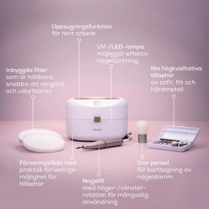 Upplev professionell nagelvård i hemmets lugna vrå med Beurer MP 200 StudioNails Pro. Denna allt-i-ett-enhet kombinerar tre viktiga funktioner – nagelfil, UV/LED-lampa och dammutsug – i en kompakt och kraftfull design. Oavsett om du arbetar med naturliga naglar, akryl, gelé eller UV-lack, levererar MP 200 salongsliknande resultat med precision och enkelhet. Perfekt för både nybörjare och proffs som vill ha snygga naglar – varje gång.