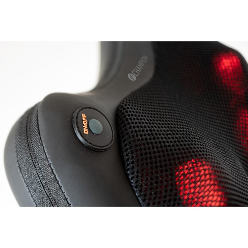 Med Champions massagekudde kan du ge dina trötta och stela rygg-, nack- och benmuskler en skön massage när du vill. Kuddens roterande massagehuvuden masserar både mot- och medurs samtidigt som värmefunktionen hjälper till att göra massagen mer verksam. Kudden passar lika bra att använda hemma som på kontoret och resårbandet på baksidan gör att du enkelt kan fästa den på till exempel en stol.