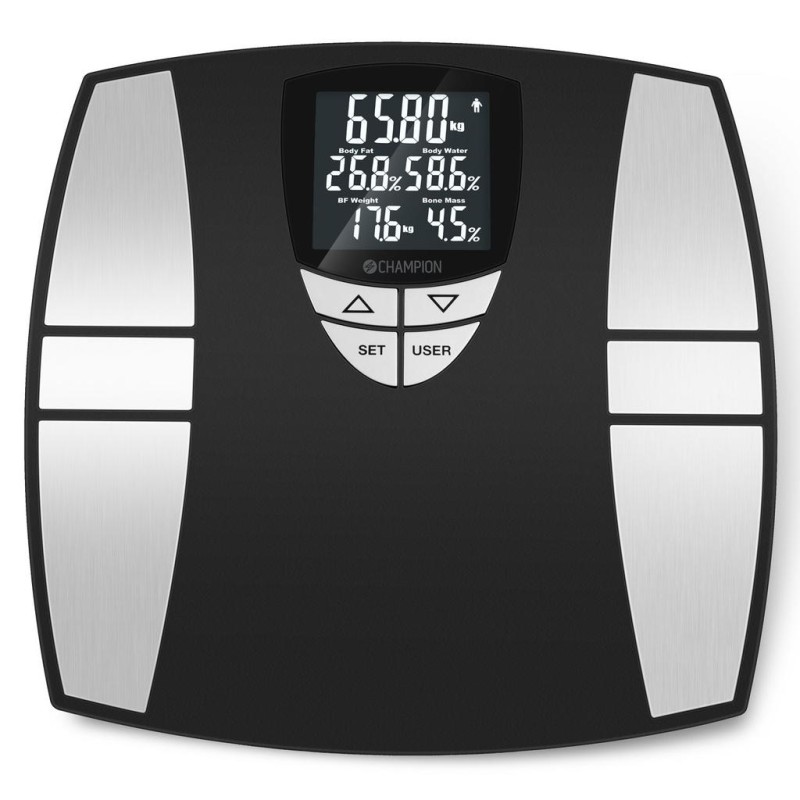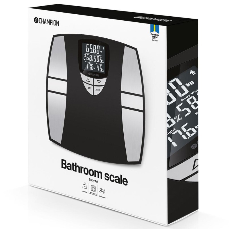 Med Champions Personvåg Body Fat tar du kontroll över din hälsa - mät vikt, kroppsfett, kroppsvatten och benmassa. En extra stor display är till för dig som vill ha en funktionell och tydlig personvåg, med alla de funktioner som krävs för att kunna överskåda all din kroppsdata. Med den stilrena designen, möjlighet till 8 olika användare och en maxkapacitet på 200kg passar den de flesta. Den stora displayen gör det enkelt att se resultatet av vägningen.