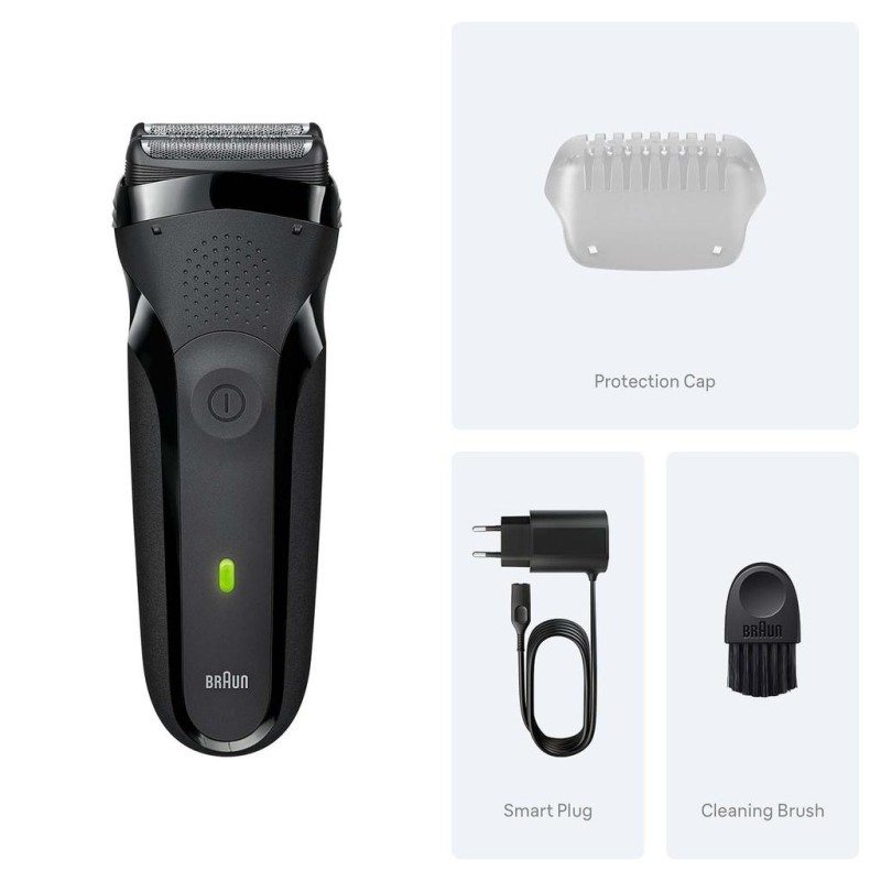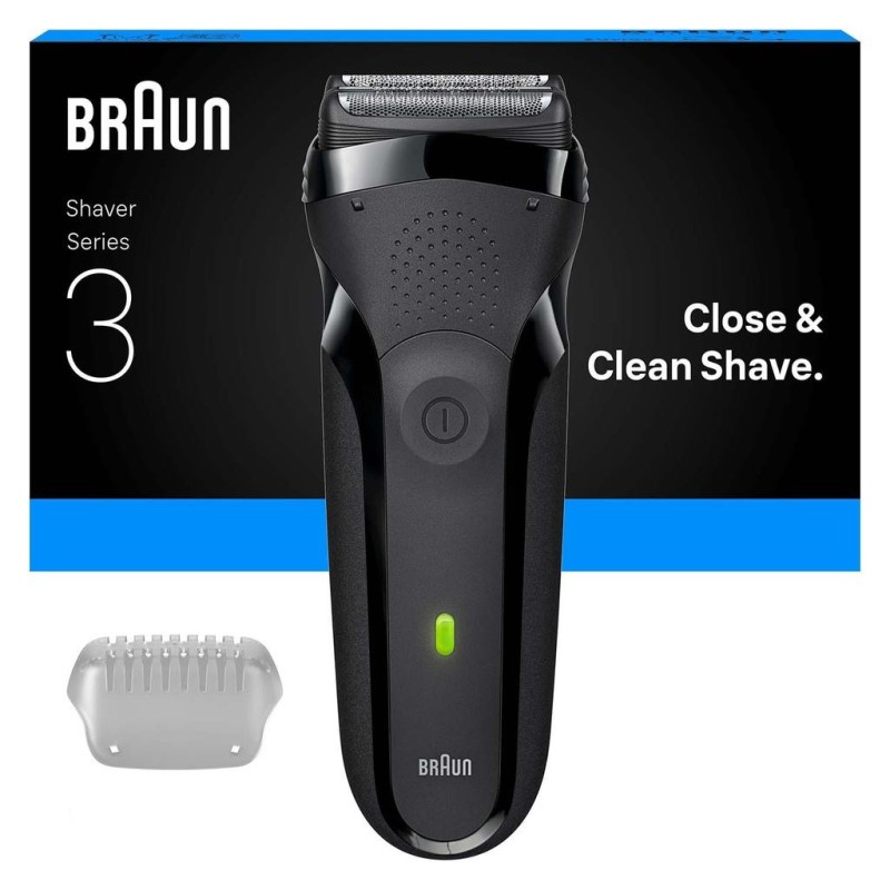 Brauns Series 3 elektriska rakapparat erbjuder en nära och ren rakning. Den har 2 folie skärelement och 1 centrumtrimmer för att raka längre hår. De Flexibla bladed anpassar sig efter ansiktets konturer. Smalt rakhuvud, för en enkel rakning även på svåråtkomliga områden. Series 3 elektrisk rakapparat för män är vattentät. Designad i Tyskland. Innehåll i lådan: 1x Braun Series 3 rakapparat, 1x skyddskåpa