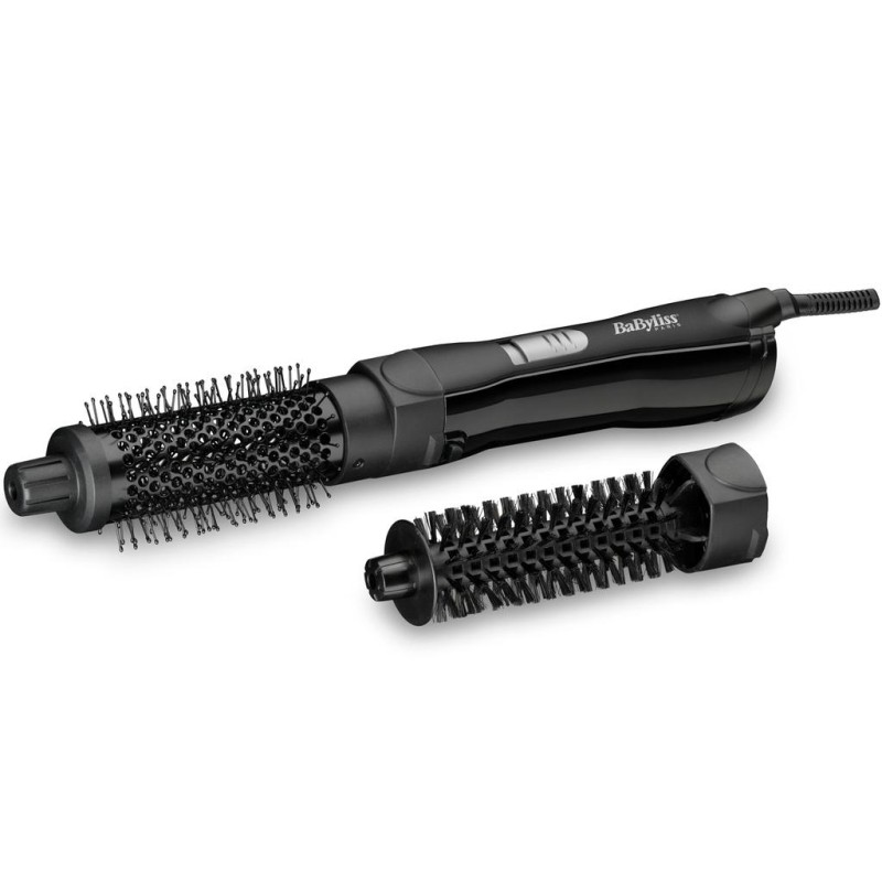 En kraftig 800 W varmluftsborste med två utbytbara borsthuvuden för att torka och forma ett fuktigt hår