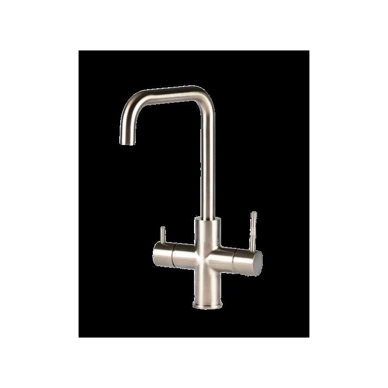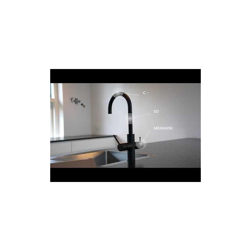 Mekanisk U-armatur i stål med snygg design som passar det moderna köket. Enkel hantering, snygg finish av hög kvalitet. Höger sida används för vanligt kallt och varmt vatten och vänster sida för kokande vatten. Produkten är barnsäker, vilket innebär att handtaget på vänster sida måste tryckas in och sedan tryckas tillbaka för att få ut kokande vatten. När handtaget släpps slutar vattnet att komma ut.