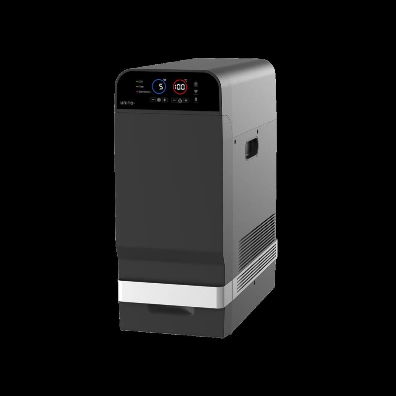 UNITO INFINITY SMART VATTENSYSTEM levererar filtrerat vatten, isvatten, (3-12°C), kolsyrat vatten, kokande (60-100°C) vatten, varmt och kallt kranvatten.