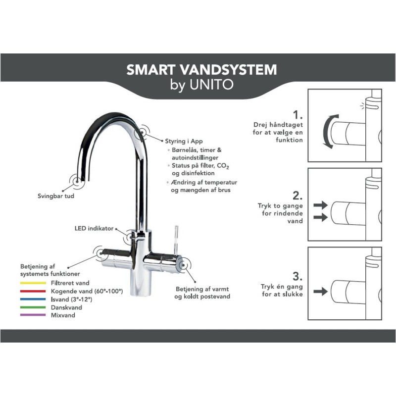 Det vänstra handtaget används för att styra systemets funktion och med LED-indikatorn på framsidan visar den vilken funktion som är vald. Välj antingen att hålla in den så rinner vattnet ut tills du släpper eller tryck två gånger så rinner vattnet ut utan att du trycker på handtaget igen