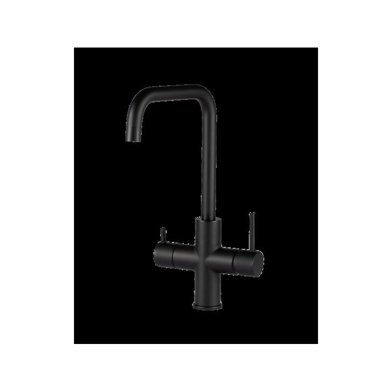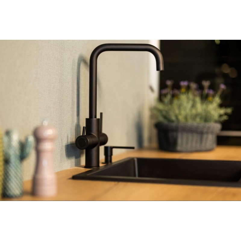 Mekanisk armatur U-armatur i svart, snygg design som passar det moderna köket. Enkel hantering, snygg finish av hög kvalitet. Höger sida används för vanligt kallt och varmt vatten och vänster sida för kokande vatten. Produkten är barnsäker, vilket innebär att handtaget på vänster sida måste tryckas in och sedan tryckas tillbaka för att få ut kokande vatten. När handtaget släpps slutar vattnet att komma ut.