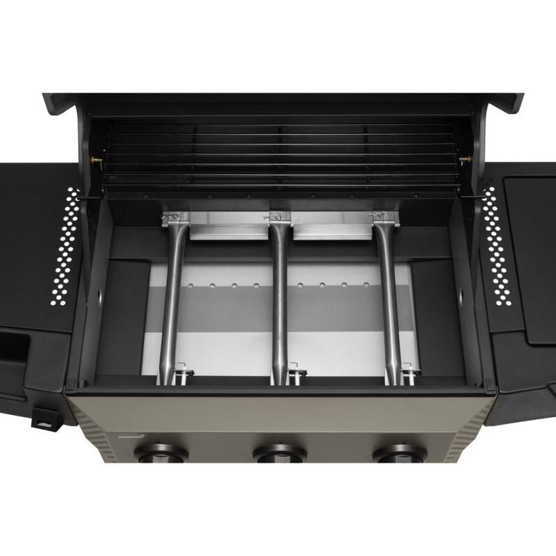 Grillens tre huvudbrännare är i rostfritt stål med en effekt på 3,3 kW vardera, även den rostfria sidobrännaren har en effekt på 3,3 kW.