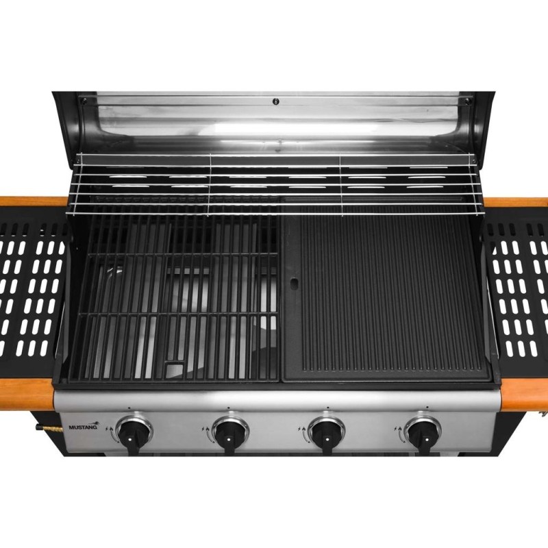 Gasolgrillen är utrustad med fyra kraftfulla huvudbrännare tillverkade i gjutjärn, vilket ger en imponerande total effekt på 14,0 kW. Den har en praktisk integrerad piezo-tändning som aktiveras genom vreden. Grillytan mäter 77 x 41 cm och inkluderar ett mattemljerat gjutjärnsgaller på 38 x 41 cm samt en stekyta i gjutjärn på samma mått.