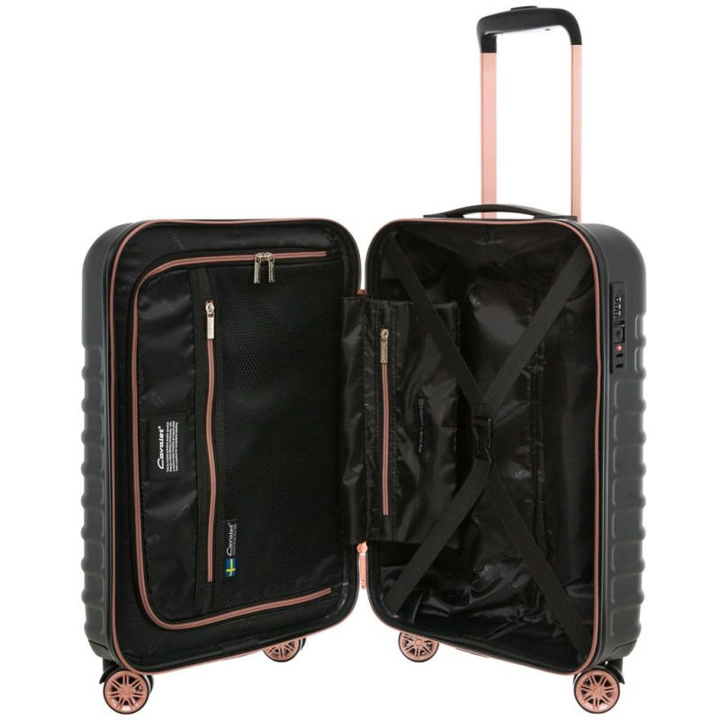 Genomtänkta detaljer som matchar rakt igenom. Dubbelhjul gör den stabil och lättmanövrerad, en inredning som följer väskans yttre färgkombinationer. Detaljer som nätficka och fack för småprylar, avdelare och packband där du placerar dina kläder som ligger säkert på plats.