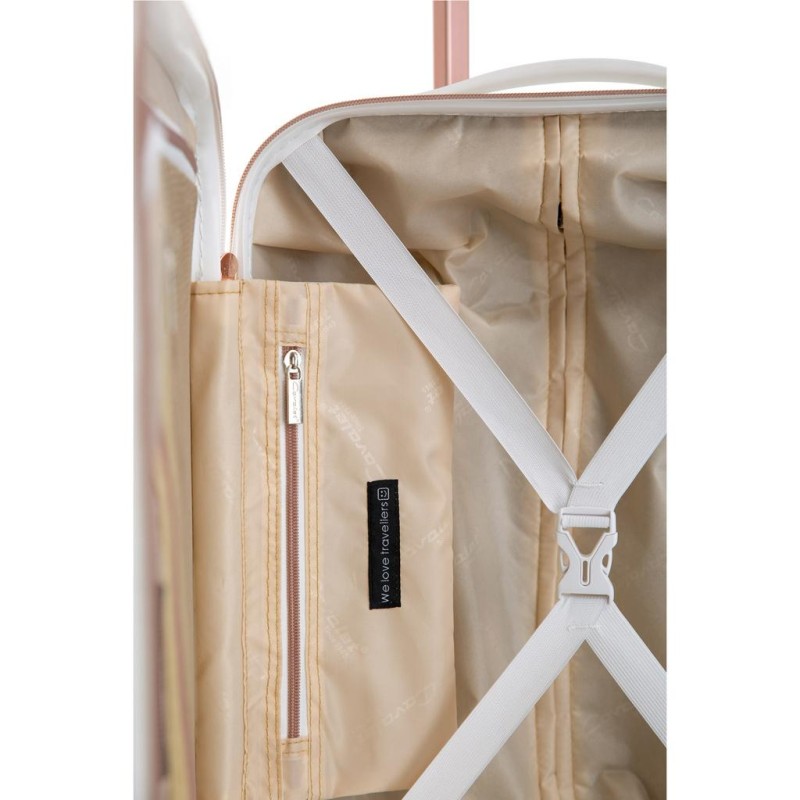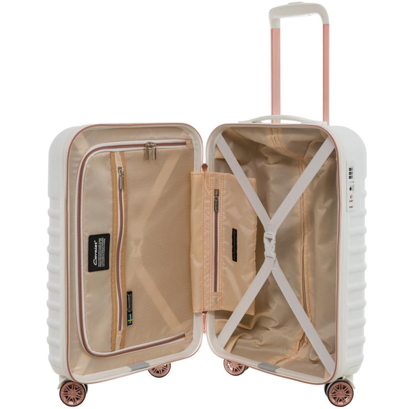 Genomtänkta detaljer som matchar rakt igenom. Dubbelhjul gör den stabil och lättmanövrerad, en inredning som följer väskans yttre färgkombinationer. Detaljer som nätficka och fack för småprylar, avdelare och packband där du placerar dina kläder som ligger säkert på plats.