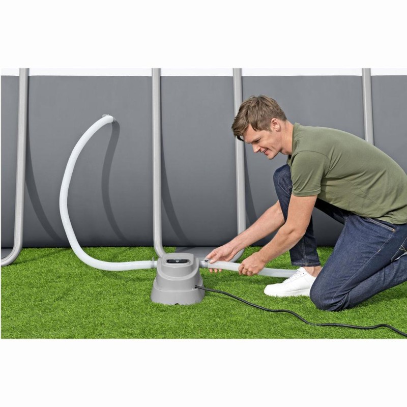 Denna elektriska poolvärmare är ett enkelt och effektivt sätt att värma upp vattnet i din pool, vilket skapar en mysig och avkopplande miljö för både simning och lek.