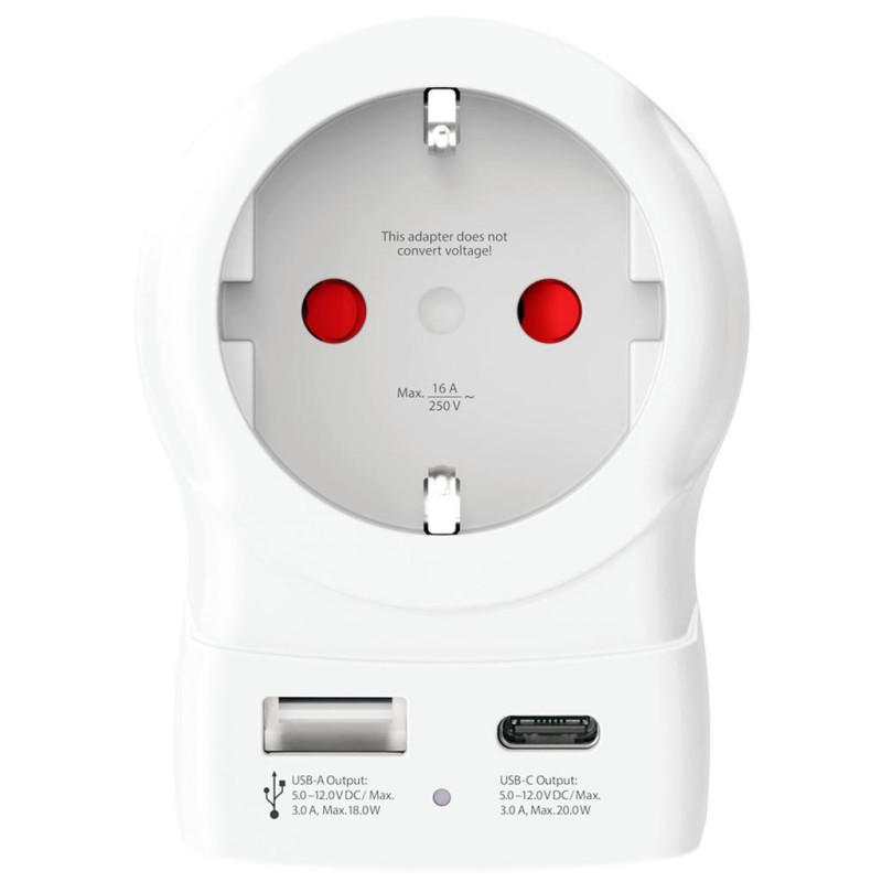 Den stöder på ett säkert sätt även strömkrävande enheter som bärbara datorer och hårtorkar, samtidigt som den möjliggör effektiv laddning av två USB-enheter samtidigt.