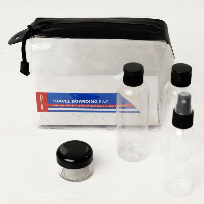 Cavalet reseflaskor för att ta med vätska i kabinen. Flaskorna ligger i en plastnecessär med dragkedja.
