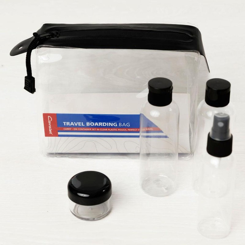 Cavalet reseflaskor för att ta med vätska i kabinen. Flaskorna ligger i en plastnecessär med dragkedja.