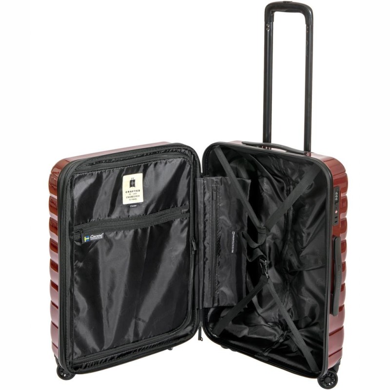 Självklart helfodrad inredning med packband och avdelare, som underlättar för dig när du packar. Fast TSA-lås. Expanderbar. Fyra tystgående hjul. Helt integrerat teleskophandtag.