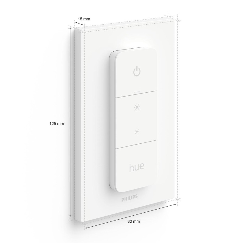 - Få direkt kontroll över din smarta Philips Hue-belysning med Hue Dimmer Switch. Med bara ett knapptryck kan du dimra hela hemmet eller lysa upp ett rum, tända och släcka lampor eller ställa in ljusscener.