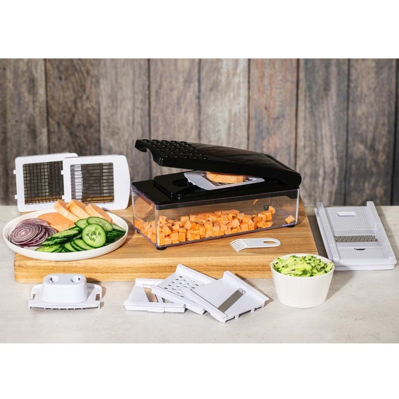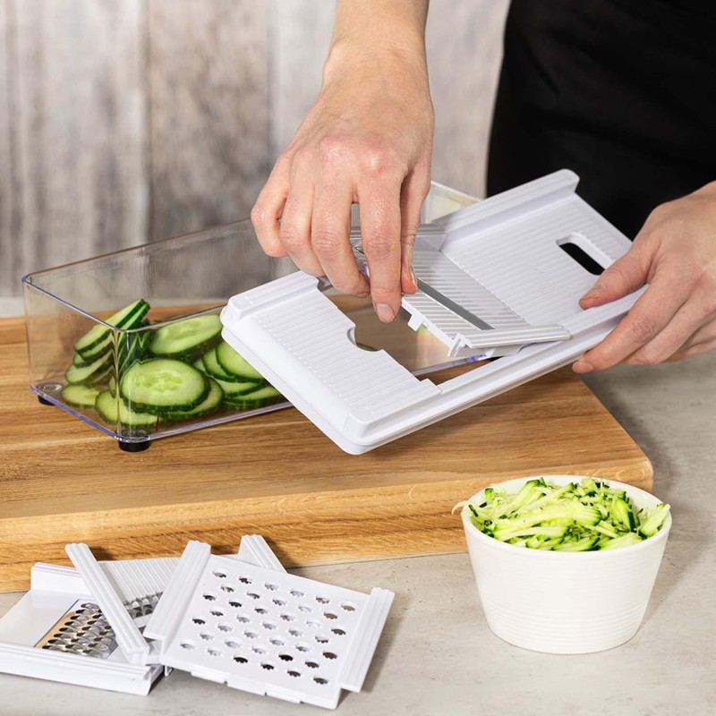 Med denna klassiska och mångsidiga grönsaksskärare kan du enkelt riva, skiva, tärna och strimla dina grönsaker på nolltid. Setet innehåller 7 utbytbara blad, ett praktiskt fingerskydd och en skrapa som gör matlagningen både säker och snabb. Alla blad är avtagbara, vilket gör rengöringen smidig och enkel.