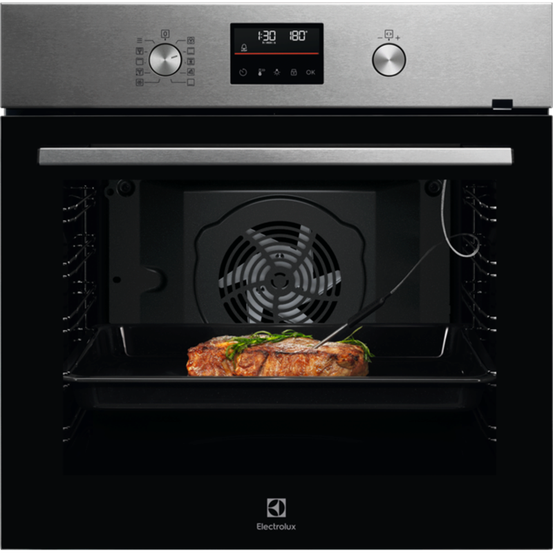 Med Electrolux 600 SenseCook® får du en ugn som övervakar innertemperaturen i maten och stänger av sig själv när allt är perfekt tillagat. Tack vare varmluftssystemet får du jämn värmefördelning och snabb uppvärmning, medan pyrolytisk rengöring gör städningen enkel – inga kemikalier, bara torka bort askan.