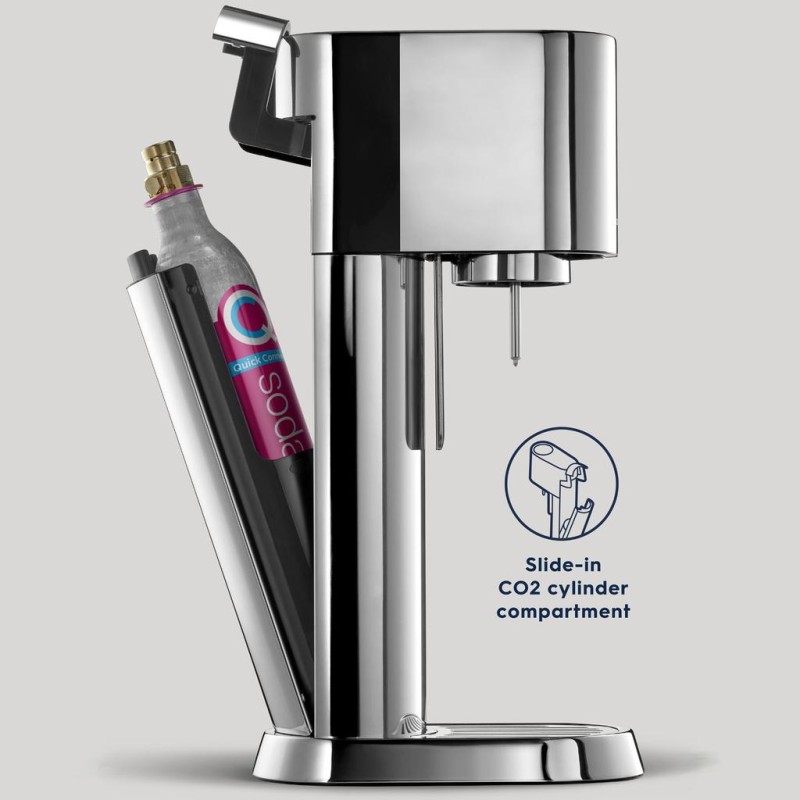 För att göra tillsättningen av kolsyra ännu enklare har ensō™ utrustats med flera smarta funktioner. Snap-lock-funktionen gör det enkelt att sätta i och ur flaskan utan att behöva skruva fast den. Den är även utrustad med Quick Connect, en patenterad teknik för snabb och enkel cylinderisättning. För att göra cylinderbytet ännu enklare har ensō™ ett utfällbart cylinderfack, som gör att cylindern kan sättas i utan att maskinen behöver flyttas.