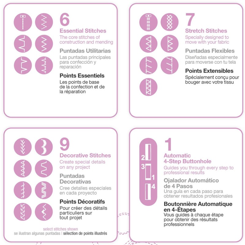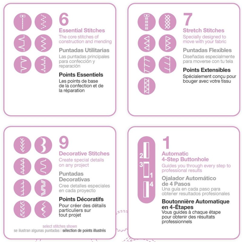 Lätt att förstå så du snabbt kommer igång med dina sömnadsprojekt - sewing has never been so Simple! Vår senaste mekaniska Singer modell som är enkel och lätt att sy på med god prestanda till ett fantastiskt pris! 23 sömmar varav ett 4-stegs knapphål, frontmatad undertråd, friarm, stygnbredd 5mm, ställbar stygnlängd 4mm, praktiskt utformad trädningsguide. Sömmar : 6 grundsömmar, 9 dekorativa sömmar, 7 stretchsömmar, ett 4-stegs knapphål