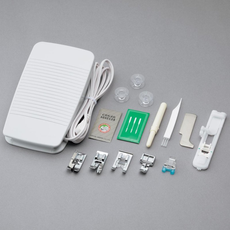 - Tryckfötter: zigzagfot, knapphålsfot, knappisyningsfot, overlockfot, dragkedjefot, blindsömsfot och monogramsyningsfot