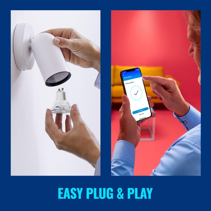 Få ditt hem att skina med en strålandefärgglad ljusatmosfär med utbudet av WiZ full colour smarta ljuskällor. Med dessa två GU10-spots i glas kan dina spotlights (infällda och utanpåliggande) lysa i 16 miljoner färger och ge dig precis den ljustemperatur och högkvalitativa LED-belysning som du önskar och förtjänar. Låt dig överraskas av komforten och bekvämligheten med funktionen Circadian Rhythm, som smidigt övergår från starkt dagsljus till dämpad varmvit belysning genom att följa de naturliga ljusmönster som ökar ditt välbefinnande. Upplev hur dynamiska ljuslägen badar ditt hem i färgglada ljuseffekter som efterliknar t.ex. havet eller en öppen spis, vilket skapar en uppslukande atmosfär för dina dagliga stunder.