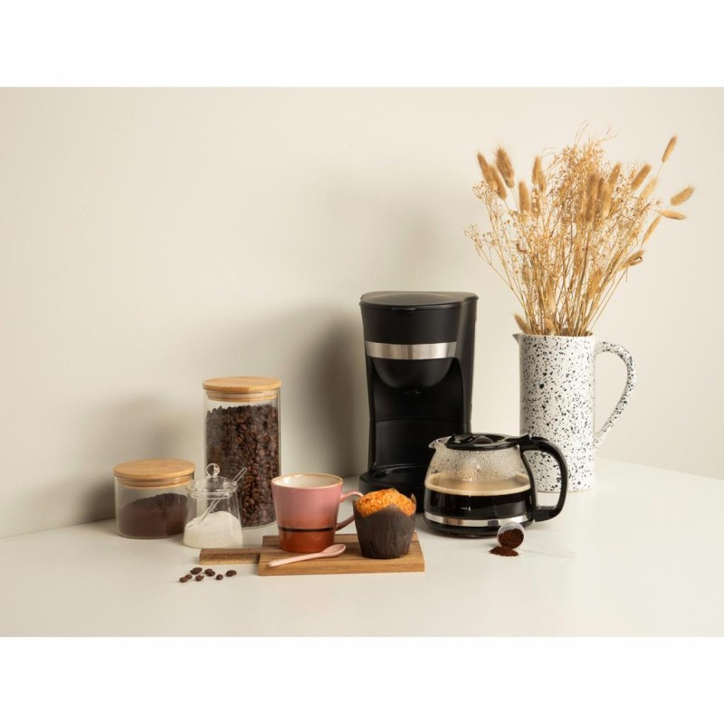 Elegant kaffebryggare i svart och rostfritt stål med kapacitet för 10– 12 koppar per bryggning (1,25 l). Den har ett droppfritt system, varmhållningsfunktion och en transparent vattenbehållare. Volym 1,25l, lämplig för 10-12 koppar.