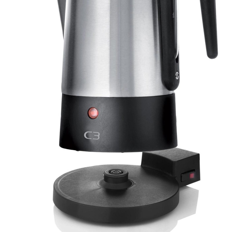 C3:s Design Perkolator finns nu med automatisk avstängning. Den är kompatibel till EU:s nya ECO-direktiv. Avstängningen sker 40 min efter påbörjad bryggning, därefter håller kaffet dricktemperatur upp till 1 timme efter avstängning tack vare kannans egenskaper.