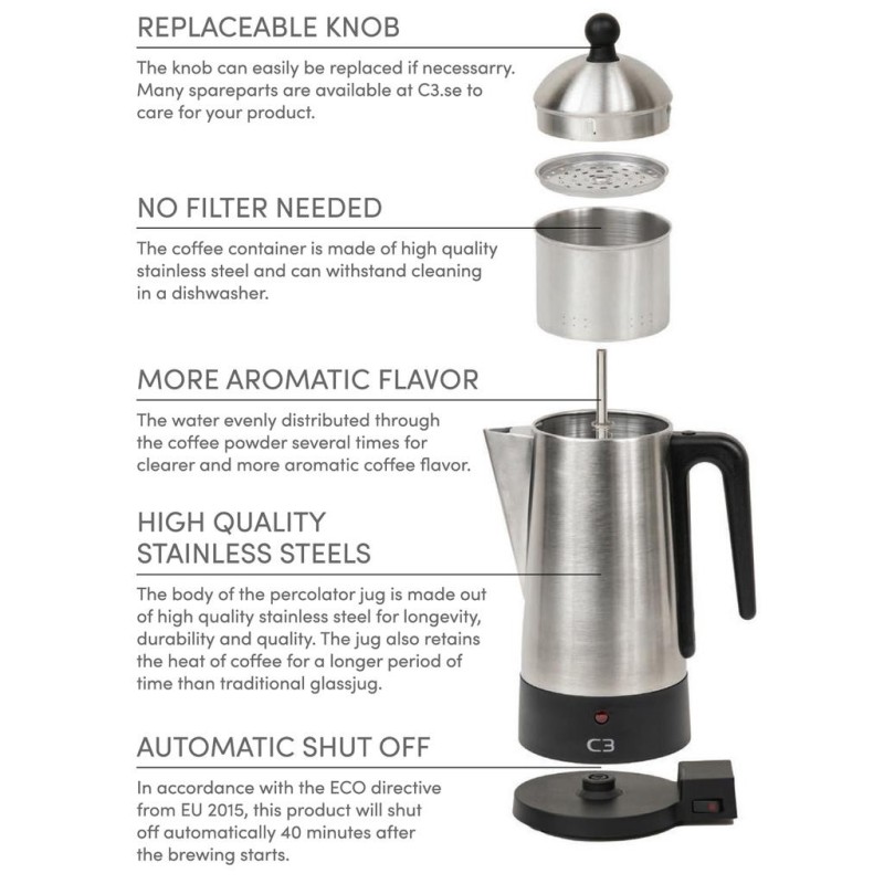 C3 Original/Basic Perkolator brygger starkt, varmt kaffe med en fin arom. Perkolatorn är tillverkad av blankpolerat rostfritt kvalitetsstål. Signallampan tänds när kaffet är klart och går automatiskt in i varmhållningsläge. Tack vare varmhållningselementet på endast 50W, kan bildning av garvsyra undvikas och kaffet smakar nybryggt flera timmar efter bryggning. Den sladdlösa utformningen underlättar serveringen. Perkolatorn har en Skandinavisk design med ett elegant intryck.