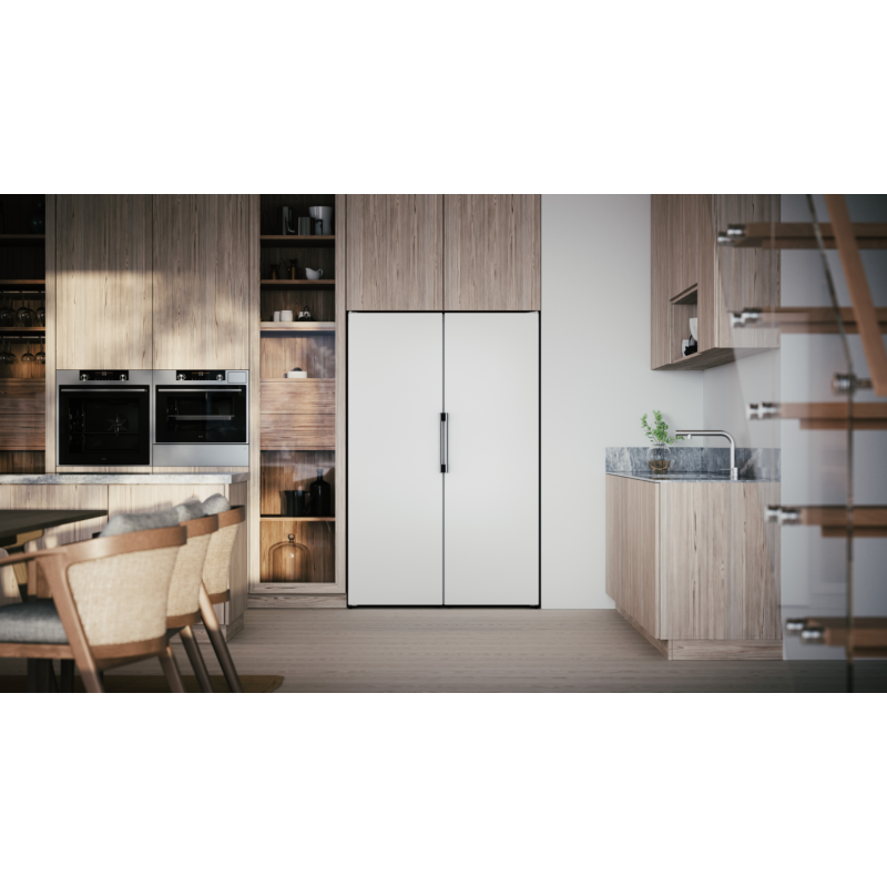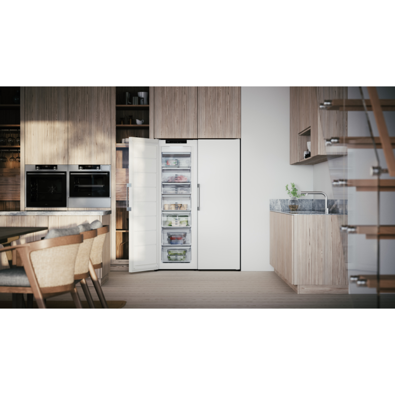 A stylish freezer in white with a vertical handle and generous volumes of 280 litre. The No Frost freezing system eliminates the need for defrosting as well as saving energy. You can store any type of food on any shelf thanks to the Cool Flow system that ensures the cool air is distributed evenly throughout the entire freezer.