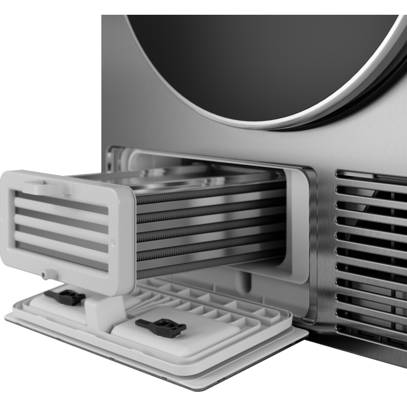 Effektiv luddfälla som förhindrar att ludd och damm når den mer känsliga och svårrengjorda kondensorn och fläkten: lätt att rengöra under rinnande vatten eller genom att bara torka av med handen; enkel öppning av dörrfiltret; bajonett- och skruvfäste för filterramen; indikering för rengöring av luddfilter som påminnelse i displayen.