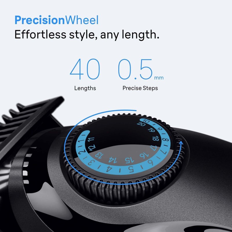 - Enkel stilkontroll: Ha full kontroll vid varje trimning med PrecisionWheel och 40 längdinställningar i steg om 0,5 mm