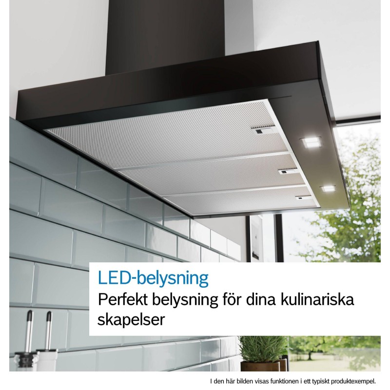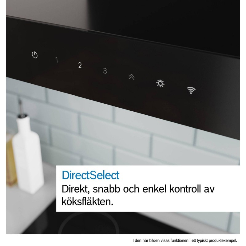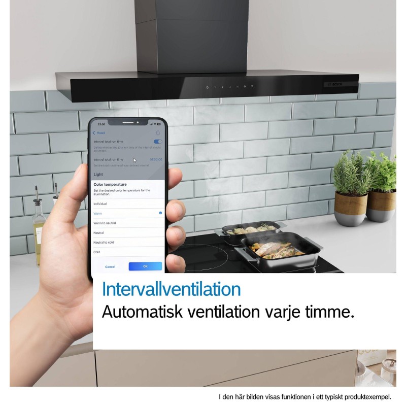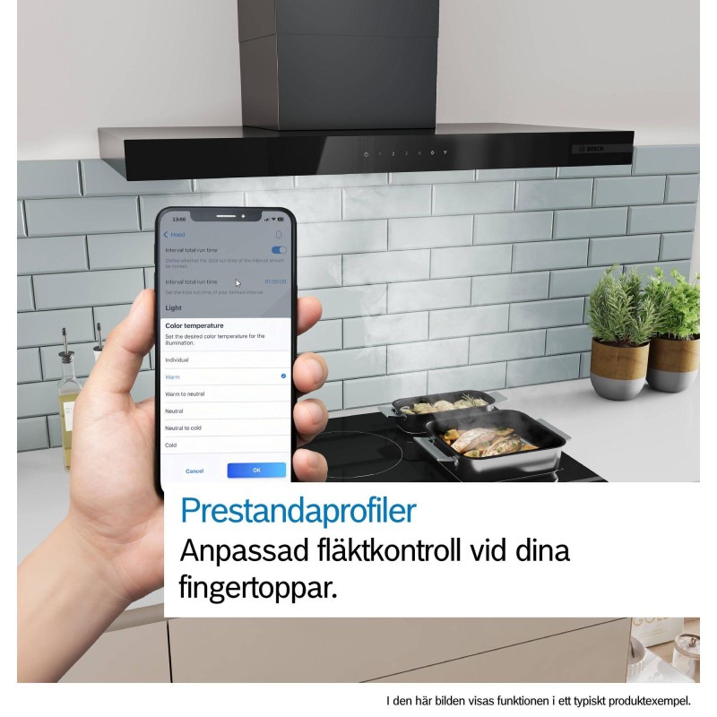 Smart Hood Automatic: Köksfläkten anpassar automatiskt fläkthastigheten tack vare att hällen kontinuerligt tillhandahåller matlagningsdata (fungerar med alla nuvarande induktionshällar i serie 6; för andra Home Connect-hällar kan köksfläkten styras direkt från hällen, förutsatt att ett anslutet Home Connect-konto finns tillgängligt).