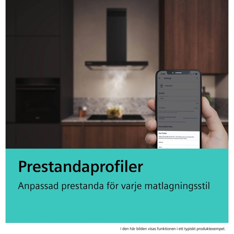 Effektprofiler: välj mellan standard-, effekt- eller tyst profil för att öka utsuget eller minska fläktljudet via Home Connect App