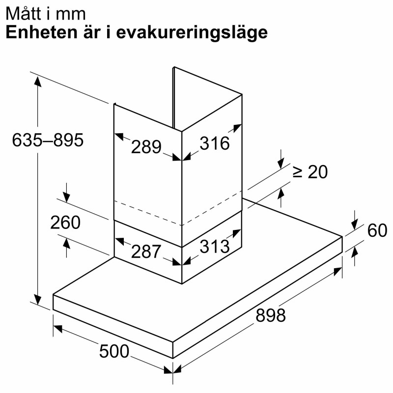 Dimensioner frånluft (HxBxD): 635-895 x 898 x 500 mm