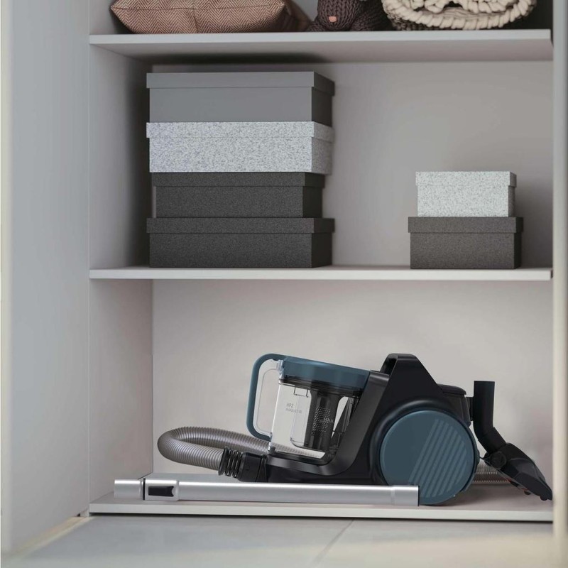 Dammsugaren är kompakt och förvaras enkelt och smidigt när den inte används.